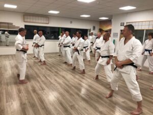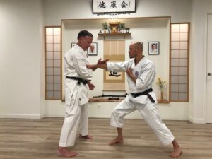 - Kihon & renketsu dosa. Het aanleren van de basisvaardigheden als stoten, trappen, verdidigen en standen doen we altijd aan het begin van de les. Beginners oefenen eerst stilstaand om zich technieken eigen te maken. Daarna volgt stap twee, de techniek oefenen met een verplaatsing. Hoe werkt je lichaam als je op een bepaalde manier gaat staan en verplaatsen naar een andere houding in combinatie met een stoot of traptechniek? We besteden aandacht aan je ademhaling stand en wortelen om je techniek te verbeteren. Is de basisvorm op orde dan volgt renketsu dosa, de combinatie technieken. Tijdens het verplaatsen ga je diverse stoten en trappen achter elkaar uitvoeren. Naarmate je langer langer traint worden de combinatie’s complexer en uitdagender.